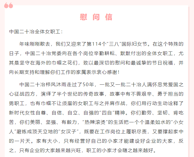 中国二十冶召开“巾帼永向党 岗位建新功 为开创企业高质量发展新局面唱响巾帼之歌”纪念“三八”国际妇女节114周年座谈会。会上,中国二十冶工会女工委全面总结了2023年度女职工工作,安排部署了2024年重点工作。各单位女工主任围绕“我们还能做些什么”同题共答,从女职工思想政治引领、维护合法权益、素质和技能提升、岗位建功成才、丰富精神文化生活等方面,结合各单位近五年女职工工作具体情况,交流分享了工作心得,谈想法提问题提建议,为女工委谋划今后五年的工作提供了重要的参考。建筑公司组织召开“柔肩担重任 巾帼展芳华”主题座谈会,表彰了2023年度优秀女职工和幸福家庭,获奖代表结合工作实际谈感受谈心得,鼓励大家继续发挥各自特长,履职尽责,狠抓执行,在平凡岗位上做出不平凡的成绩,展现女职工的新形象。