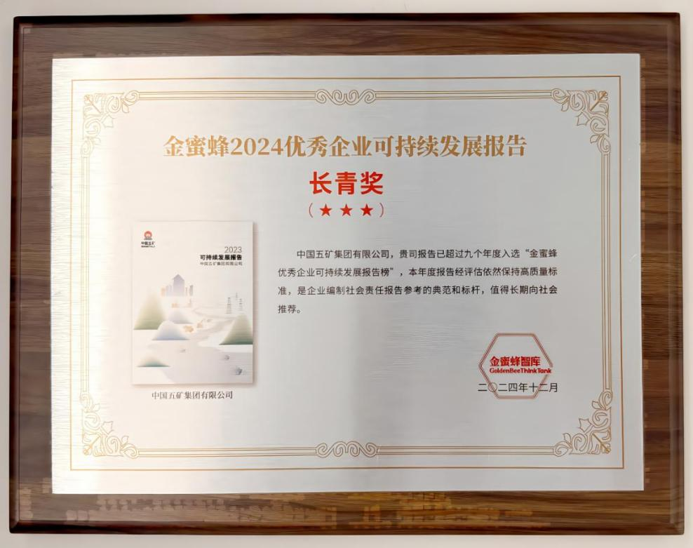 中国五矿荣获“金蜜蜂2024优秀企业可持续发展报告·长青奖三星奖”
