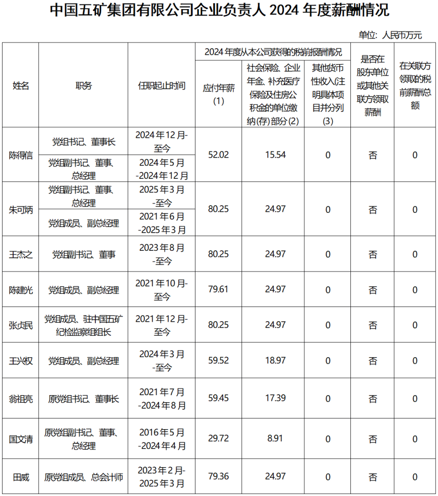 根据中央企业负责人薪酬信息公开工作的有关要求,现将中国五矿集团有限公司企业负责人2024年度薪酬情况披露如下。