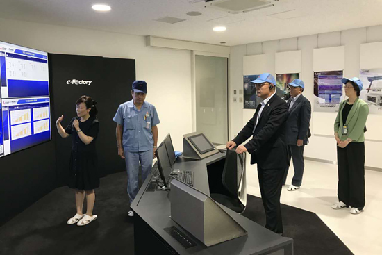 28日,何文波一行在三菱商事相关人员松井俊一、河合耕作、满江的陪同下,参观了三菱电机名古屋制作所的e-Factory示范工厂。代表团对三菱电机在工厂自动化方面基于设备运行数据不断优化工作流程和车间布局、通过可视化手段提高精益生产效率和增强灵便制造能力所取得的成绩以及为应对地震对建筑物所采取的减震措施的一系列做法表示钦佩。