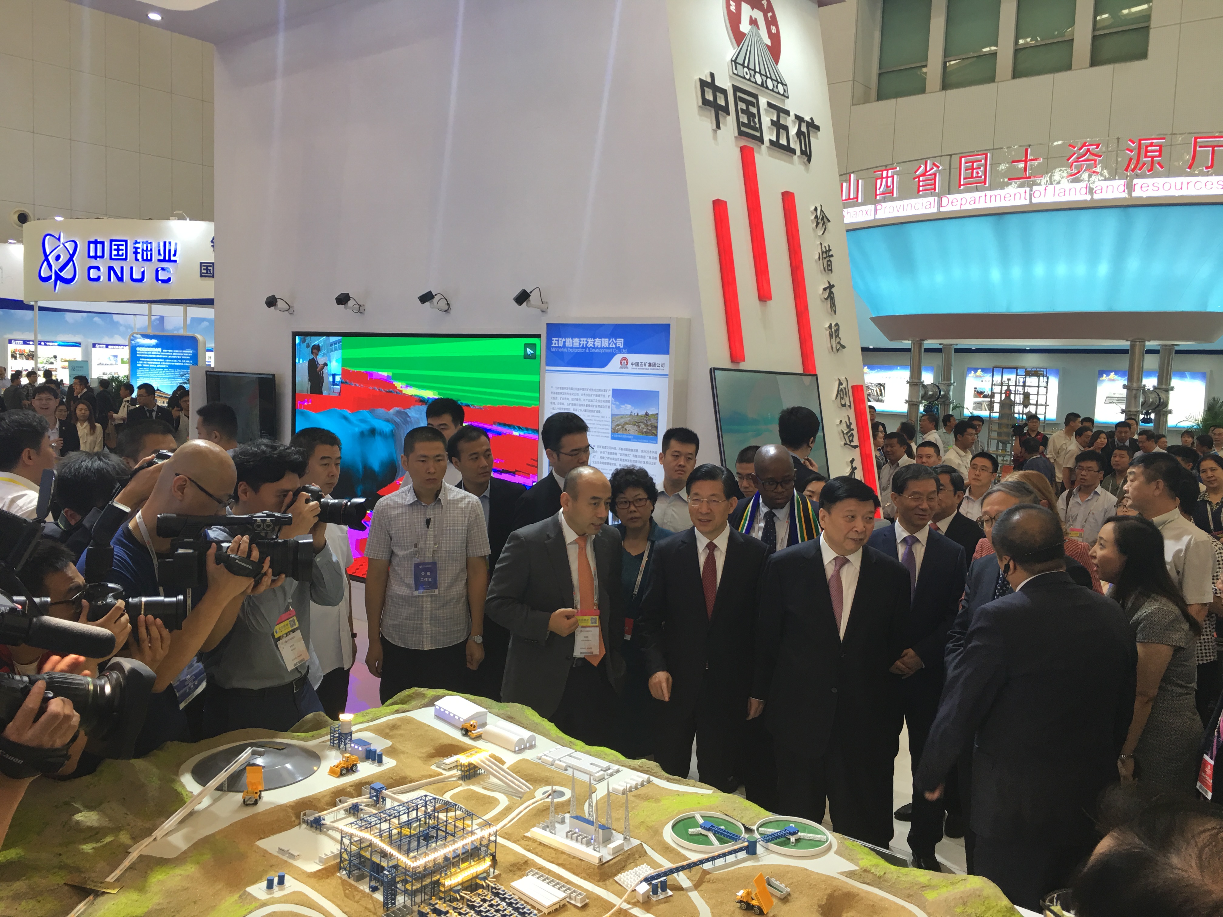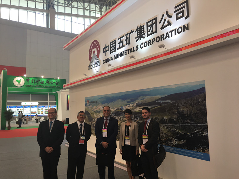 秘鲁能矿部副部长理查德·拉博(Ricardo Labo),秘鲁驻华大使胡安·卡洛斯·卡普纳伊(Juan Carlos Capunay)参观集团公司展台,在邦巴斯(Las Bambas)项目前合影留念