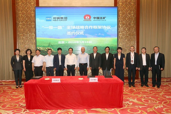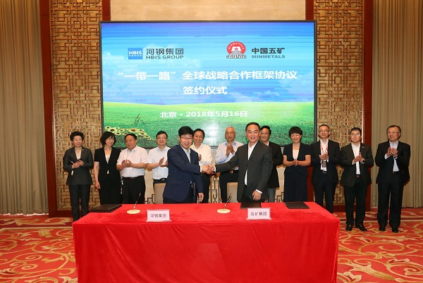 5月16日,中国五矿集团有限公司与河钢集团“一带一路”全球战略合作框架协议签约仪式在北京五矿广场举行,在中国五矿董事长、党组书记唐复平和河钢集团董事长、党委书记于勇的共同见证下,集团公司副总经理兼中冶集团总经理张兆祥与河钢集团副总经理刘键代表双方签署战略合作协议。